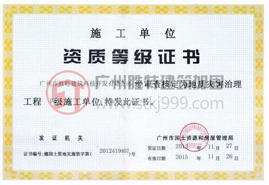地質(zhì)災(zāi)害治理工程丙級施工資質(zhì)-廣州市勝特建筑科技開發(fā)有限公司營業(yè)執(zhí)照與資質(zhì)證書展示.我司擁有建筑加固資質(zhì),特種加固資質(zhì)等一系列特種專業(yè)工程資質(zhì),專注于房屋隔震加固,粘鋼加固等工程設(shè)計及施工.廣州勝特加固公司加固技術(shù)實力雄厚,獲國家高新技術(shù)企業(yè)認證!歡迎廣大客戶來電咨詢.