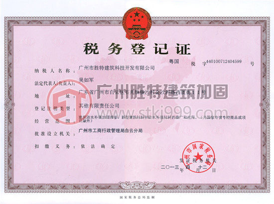 稅務(wù)登記證【國稅】-廣州市勝特建筑科技開發(fā)有限公司營業(yè)執(zhí)照與資質(zhì)證書展示.我司擁有特種加固資質(zhì),特種專業(yè)工程資質(zhì)等一系列特種專業(yè)工程資質(zhì),專注于大橋加固工程,樓板開洞加固等工程設(shè)計(jì)及施工.勝特建筑加固加固技術(shù)實(shí)力雄厚,獲國家高新技術(shù)企業(yè)認(rèn)證!歡迎廣大客戶來電咨詢.