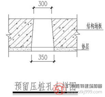 由于錨桿靜壓樁必須通過(guò)錨桿和壓樁架相結(jié)合,通過(guò)結(jié)構(gòu)自重作為壓樁反力。本工程故根據(jù)實(shí)際情況僅采用地板無(wú)法滿足施壓條件。若不采用群錨壓樁結(jié)構(gòu)專利技術(shù),只能通過(guò)堆載反壓來(lái)實(shí)現(xiàn)錨桿靜壓樁的壓樁反力。但堆載反壓反復(fù)運(yùn)輸造成人工費(fèi)用大量增加,且因堆載可能會(huì)造成建筑物產(chǎn)生附加沉降,不宜使用。故此,群錨靜壓樁技術(shù)在本工程的錨桿靜壓樁施工中具有選擇的唯一性,且安全可靠不會(huì)產(chǎn)生附加下沉,施工直接明確。其具體方法是:○1通過(guò)在結(jié)構(gòu)筏板上設(shè)置臨時(shí)型鋼骨架壓樁體系,利用該體系和筏板結(jié)構(gòu)組成剛度較強(qiáng)的較大面積筏板體系從而提供滿足壓樁要求的自重反力,使錨桿靜壓樁得以順利實(shí)施;○2通過(guò)隔行跳壓方式、結(jié)合二次反壓及多次反壓,形成帶有臨時(shí)抗拔的樁體來(lái)完成靜壓樁的實(shí)施。