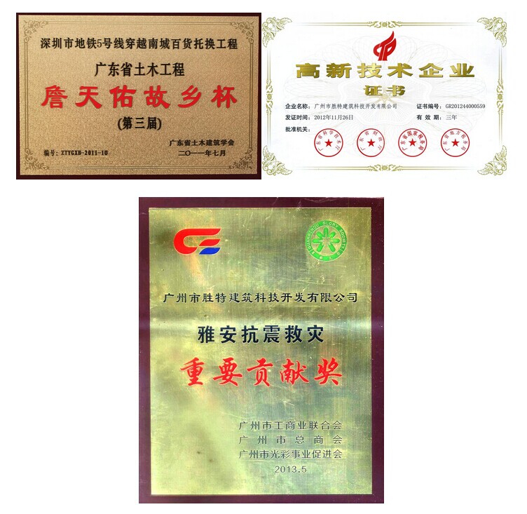 2012年,勝特公司被廣東省科技廳授予“高新技術企業”稱號,公司成為廣東省唯一一家加固改造行業的高新技術企業,也是全國同行僅有的三家高新技術企業之一。