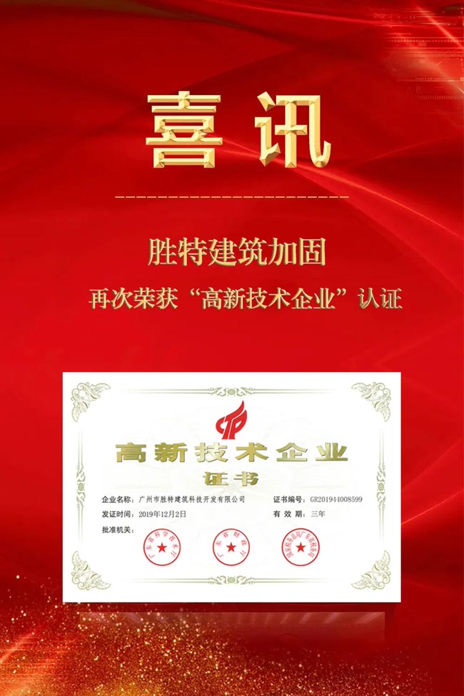 國家級高新技術企業”是指在國家重點支持的高新技術領域,持續進行研究開發與技術成果轉化,形成企業核心自主知識產權,并以此為基礎開展經營活動,將重大高新技術成果轉化成生產力的技術水平,屬于國內領先或國際先進的企業。由國家科技部審核認定的“國家級高新技術企業”稱號,是中國科技企業最高的榮譽之一,是對企業科研實力一個最權威的肯定,是企業對外交往時一張重要的“金名片”。廣州市勝特建筑科技開發有限公司能通過審核認定,充分證明了公司的科技實力和研發水平。