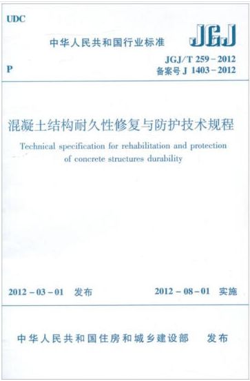 中華人民共和國行業標準《混凝土結構耐久性修復與防護技術規程》JGJ/T 259-2012以下簡稱《規程》,2012年8月1日起實施。《規程》由中冶建筑研究總院有限公司、國家工業建筑診斷與改造工程技術研究中心、上海房地產科學研究院、南京水利科學研究院、中國建筑材料科學研究總院、中國京冶工程技術有限公司、武漢理工大學、清華大學、北京交通大學、鐵路部運輸局、廣東省建筑科學研究院、廣州市勝特建筑科技開發有限公司等14家單位參編,適用于工業與民用建筑施工。