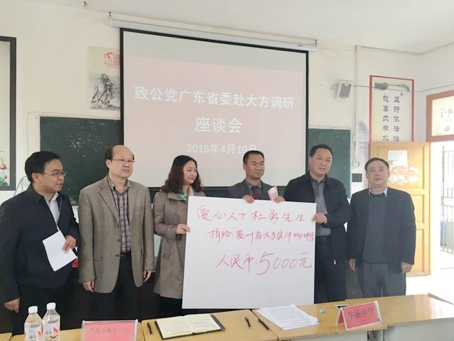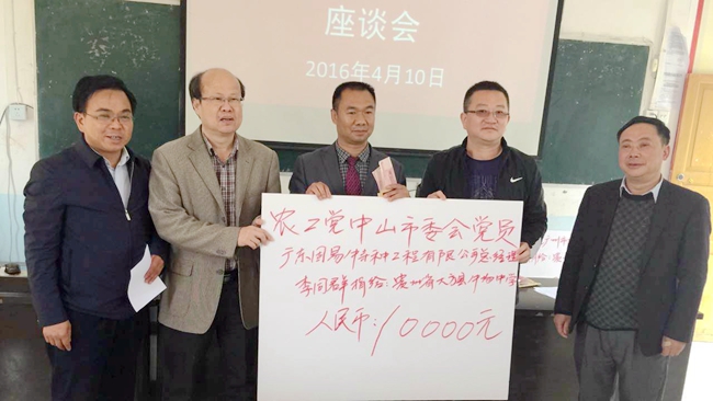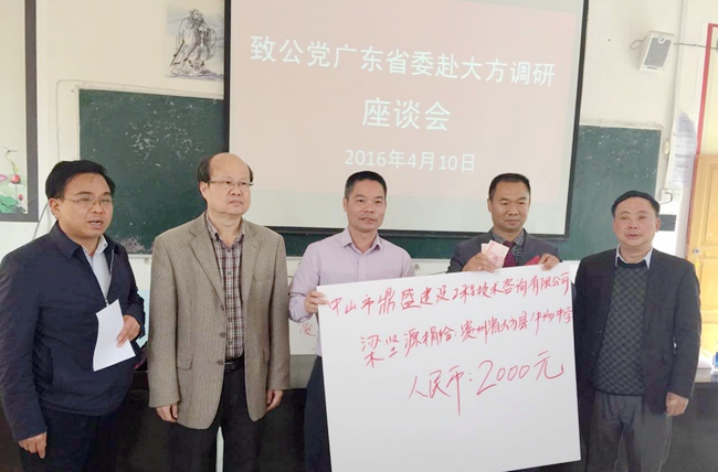 會上,我司董事長吳如軍先生帶頭向大方縣捐贈2萬元,農(nóng)工黨中山市委會黨員、廣東固易特種工程有限公司董事長李同群先生捐贈1萬元,熱心人士杜勇先生捐贈5000元,中山市鼎盛審圖公司總經(jīng)理梁堅源先生捐贈2000元;整個捐贈活動,調(diào)研組共向大方縣牛場中學捐贈3.7萬元,用于孤兒及單親家庭貧困孩子助學用途。