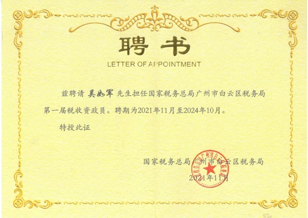 白云區(qū)稅務(wù)局領(lǐng)導(dǎo)為13名稅收資政員頒發(fā)聘書,我司吳如軍董事長(zhǎng)作為廣州市第十五屆人大代表、白云區(qū)第十七屆人大常委委員會(huì)委員受聘任為白云區(qū)首屆稅收資政員之一。