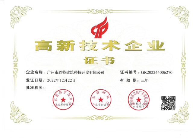 熱烈祝賀廣州市勝特建筑科技開發有限公司再次被評定為國家級高新技術企業