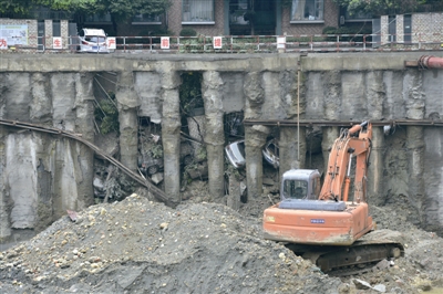 昨日凌晨,成都市城區普降大雨。早上7點,武侯區棕樹南街水漪裊銅小區停車場地面下陷,形成6米寬、10米長、4米深的深坑,停放的4輛小轎車跌入坍陷坑中,1輛小轎車懸空。塌方位置緊鄰一在建深基坑作業工地,且與小區樓房相距不足10米,居民十分擔心居住安全。