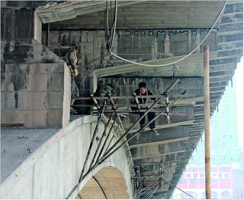 工人在橋拱上緊張施工