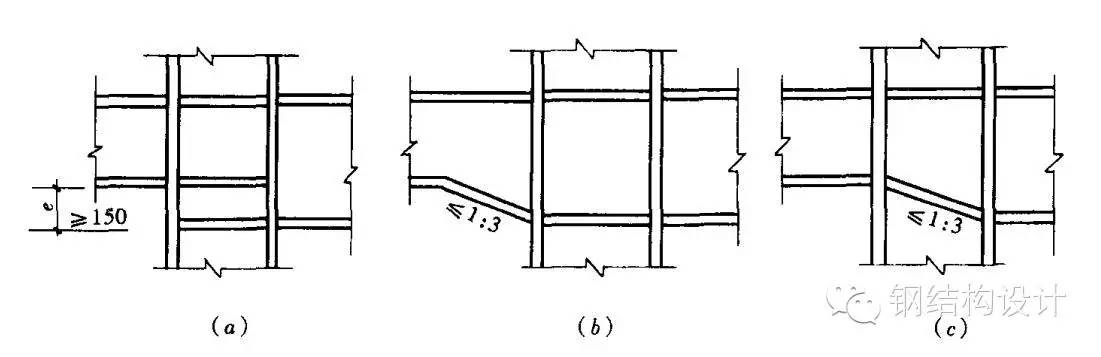 柱需要變截面時,一般采用柱截面高度不變,僅改變翼緣厚度的方法。若需要改變柱截面高度時,柱的變截面段應由工廠完成,并盡量避開梁柱連接節點。對邊柱可采用有偏心的做法,不影響掛外墻板,但應考慮上下柱偏心產生的附加彎矩,對中柱可采用無偏心的做法。柱的變截面處均應設置水平加勁肋或橫隔板。