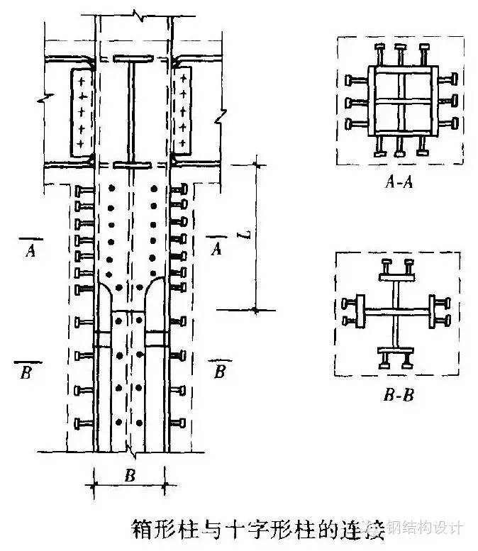 高層鋼結構中的箱形柱與下部型鋼混凝土中的十字形柱相連時,應考慮截面形式變化處力的傳遞平順。箱形柱的一部分力應通過栓釘傳遞給混凝土,另一部分力傳遞給下面的十字形柱,如下圖所示。兩種截面的連接處,十字形柱的腹板應伸入箱形柱內,形成兩種截面的過渡段。伸入長度應不小于柱寬加200mm,即L≥B+200mm,過渡段截面呈田字形。過渡段在主梁下并靠緊主梁。