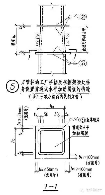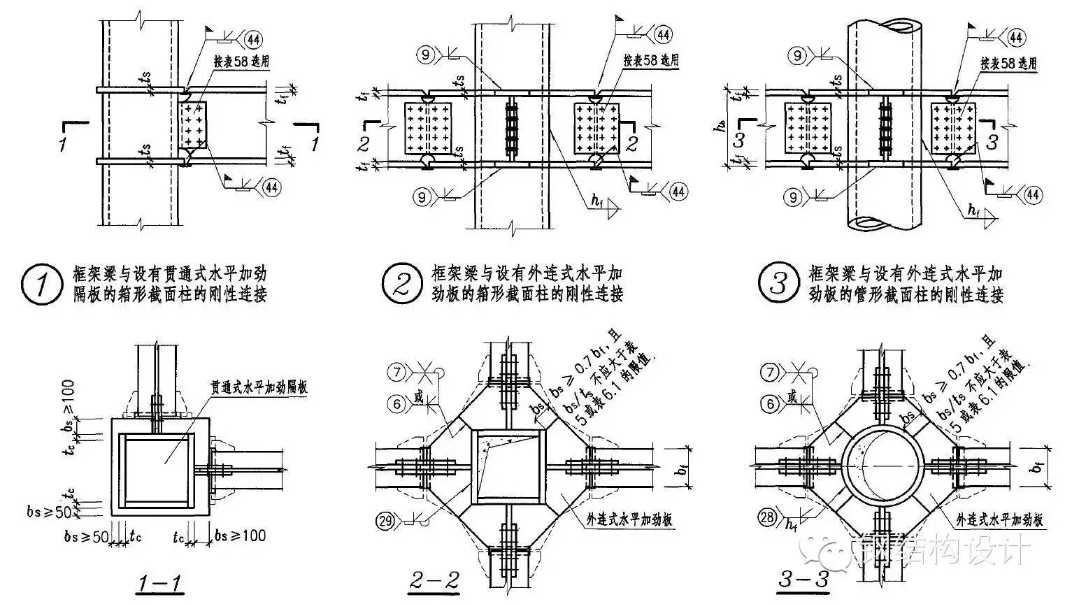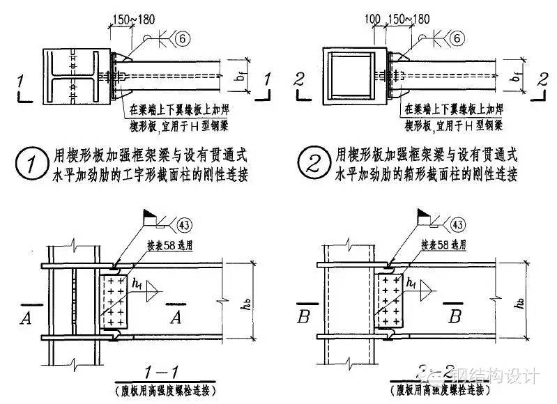 (1)工字形梁與工字形柱或箱形柱剛性連接的細部構造: